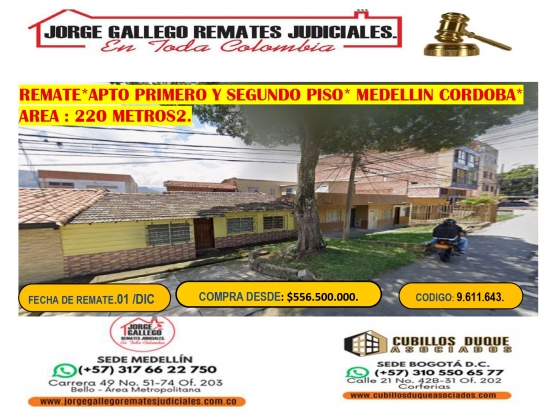 REMATE *APTO PRIMER Y SEGUNDO PISO* MEDELLIN BARRIO CORDOBA.