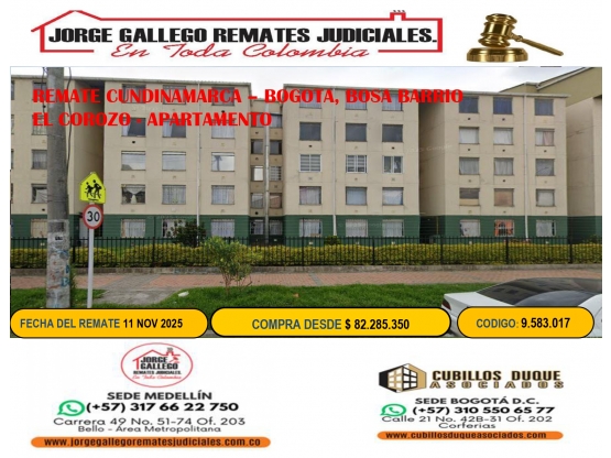 REMATE CUNDINAMARCA – BOGOTA, BOSA BARRIO EL COROZO - APARTAMENTO