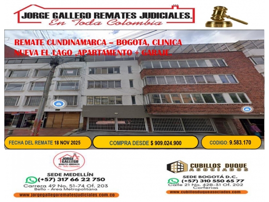 REMATE BOGOTA, CLINICA NUEVA EL LAGO ,APARTAMENTO + GARAJE.