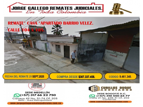 REMATE*CASA *APARTADO BARRIO VELEZ.