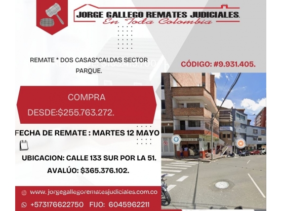 REMATE * DOS CASAS*CALDAS SECTOR PARQUE.
