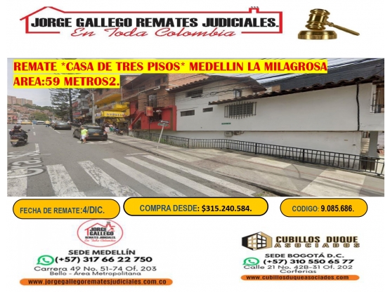 REMATE CASA DE TRES PISOS EN *MEDELLIN LA MILAGROSA.