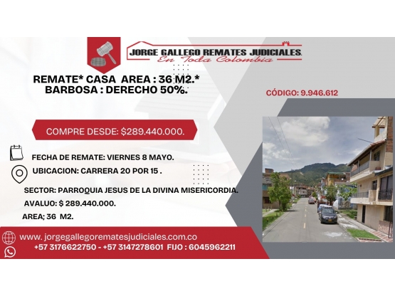 REMATE* CASA AREA :36 M2.* BARBOSA : DERECHO 50%.