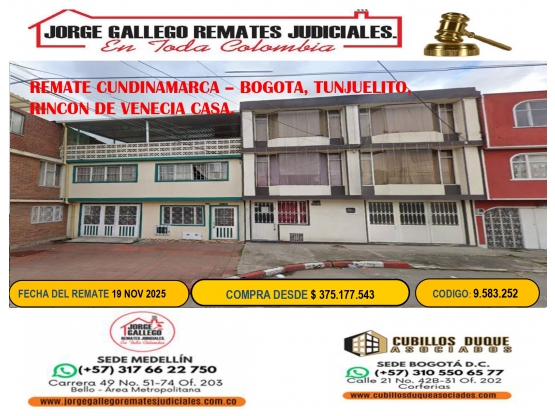 REMATE CUNDINAMARCA – BOGOTA, TUNJUELITO, RINCON DE VENECIA CASA