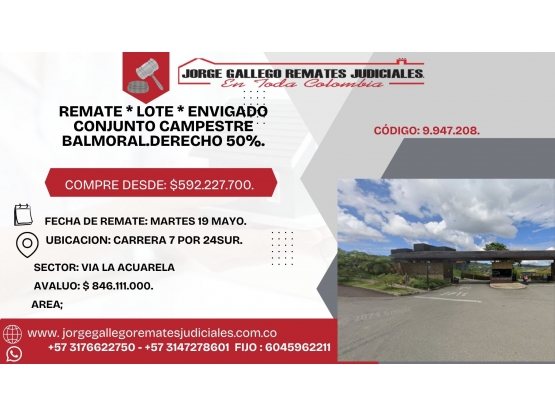 REMATE * LOTE * ENVIGADO CONJUNTO CAMPESTRE BALMORAL.DERECHO 50%.